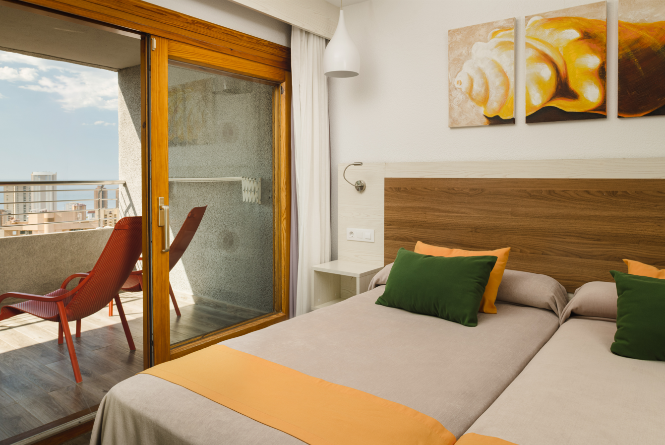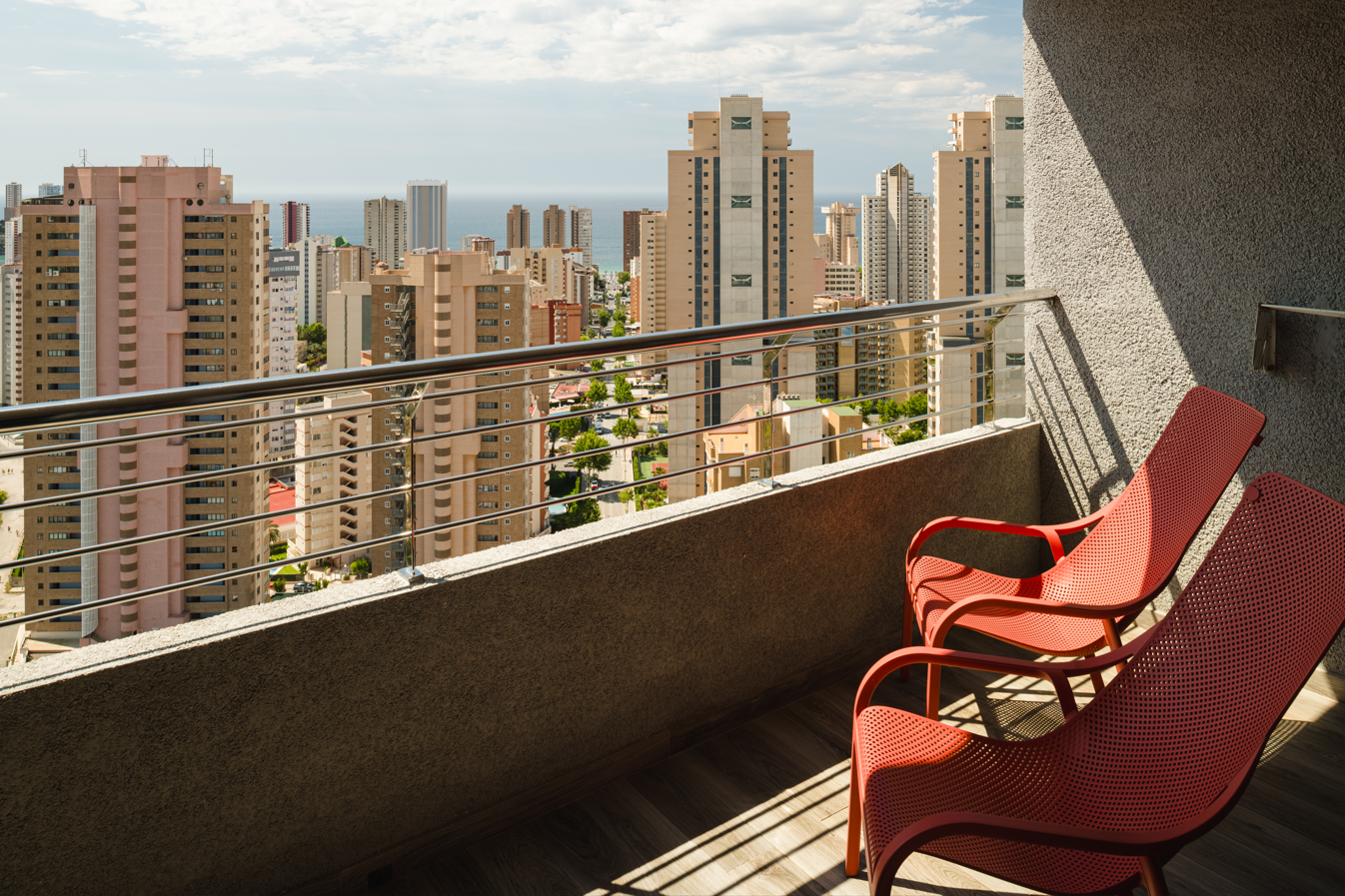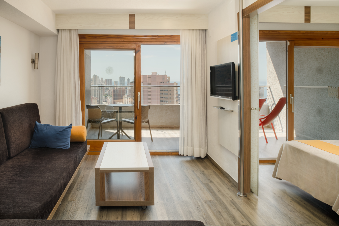 Si buscas algo especial, esta junior suite ofrece una ubicación privilegiada en las plantas más altas, con vistas panorámicas hacia Benidorm.