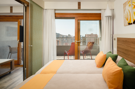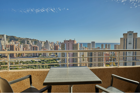 Si buscas algo especial, esta junior suite ofrece una ubicación privilegiada en las plantas más altas, con vistas panorámicas hacia Benidorm.