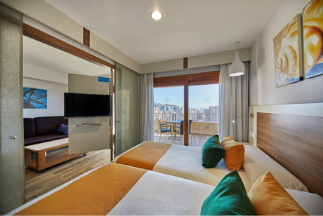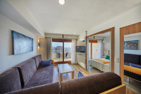 Disfruta de una cómoda habitación con dos camas individuales, un salón con dos sofás cama, pudiendo separar las dos estancias con puertas correderas, y un balcón amueblado con vistas frontales privilegiadas a nuestra piscina. El baño dispone de una ducha a ras de suelo y productos de aseo gratuitos. Perfecta para familias o grupos pequeños que buscan confort y amplitud.